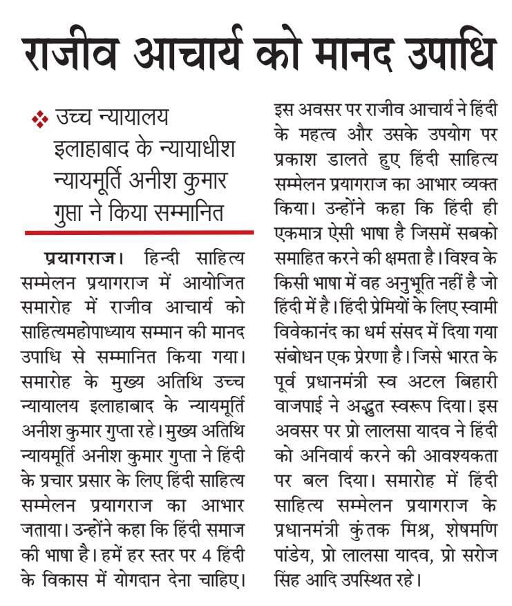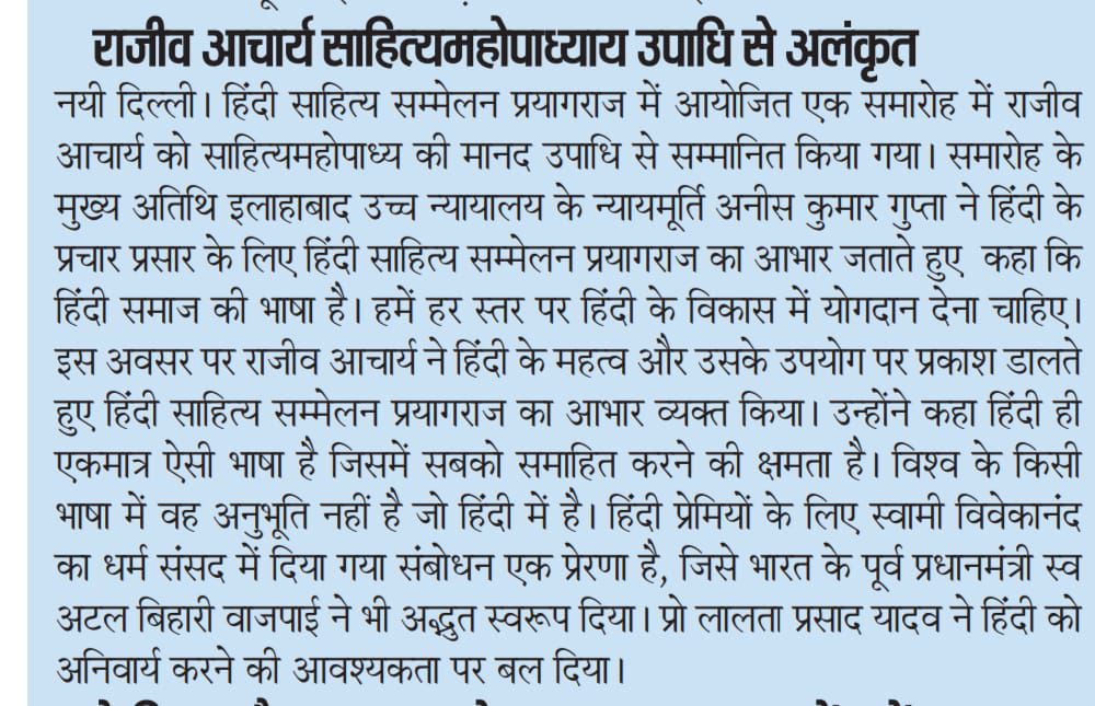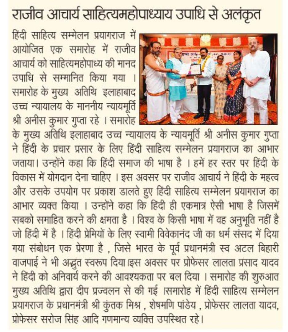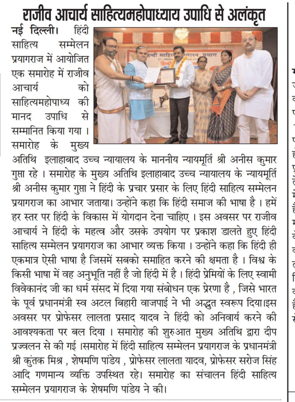 राजीव आचार्य ‘साहित्यमहोपाध्याय’ उपाधि से सम्मानित