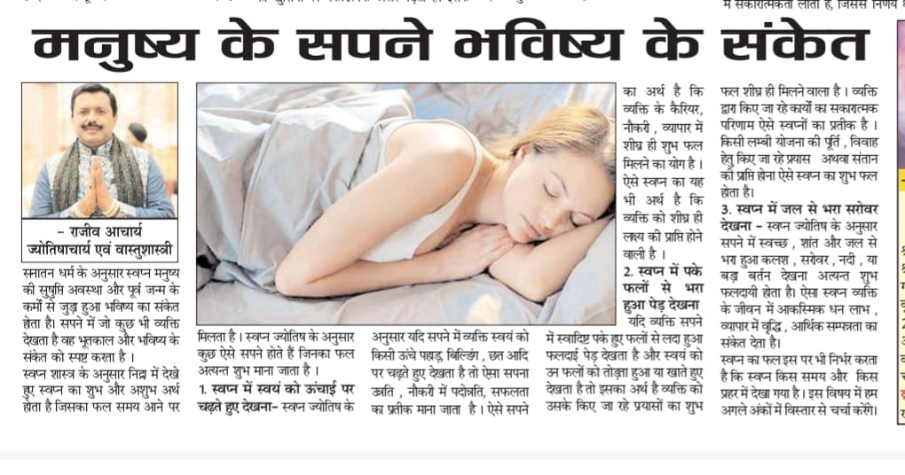 स्वतंत्र भारत समाचार पत्र में प्रकाशित इस विशेष लेख में ज्योतिषाचार्य राजीव आचार्य बताते हैं कि मनुष्य के सपने केवल कल्पना नहीं होते, बल्कि वे आने वाले समय के संकेत भी देते हैं।स्वप्न शास्त्र के अनुसार सपने मनुष्य की मानसिक, आध्यात्मिक और भावनात्मक अवस्था से जुड़े होते हैं। कुछ सपने सफलता, उन्नति और शुभ समाचार […]