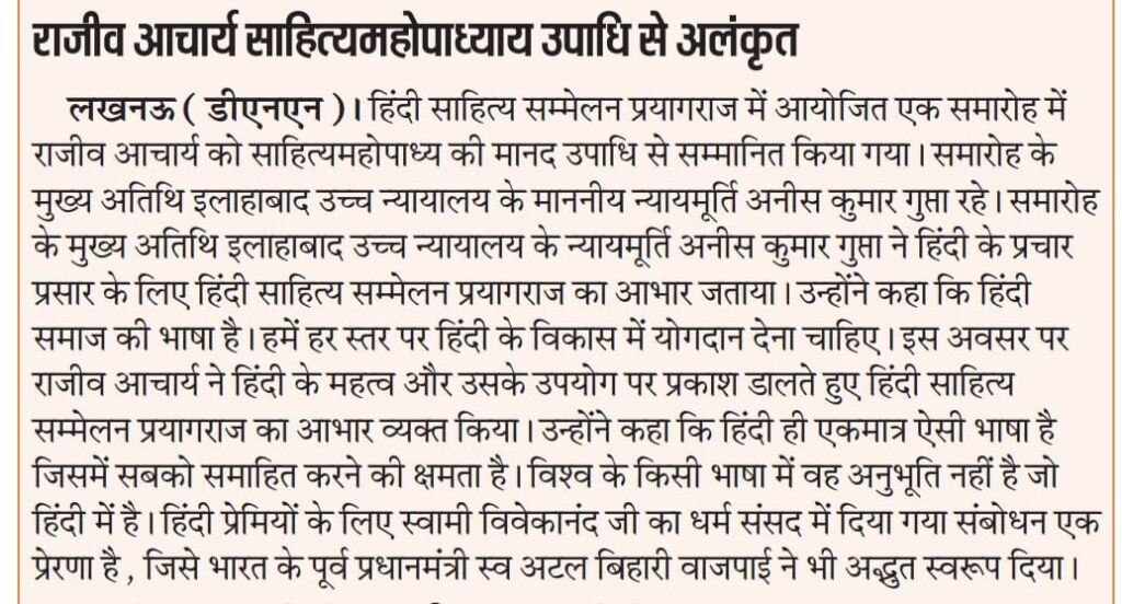 DNN: राजीव आचार्य ‘साहित्यमहोपाध्याय’ उपाधि से सम्मानित