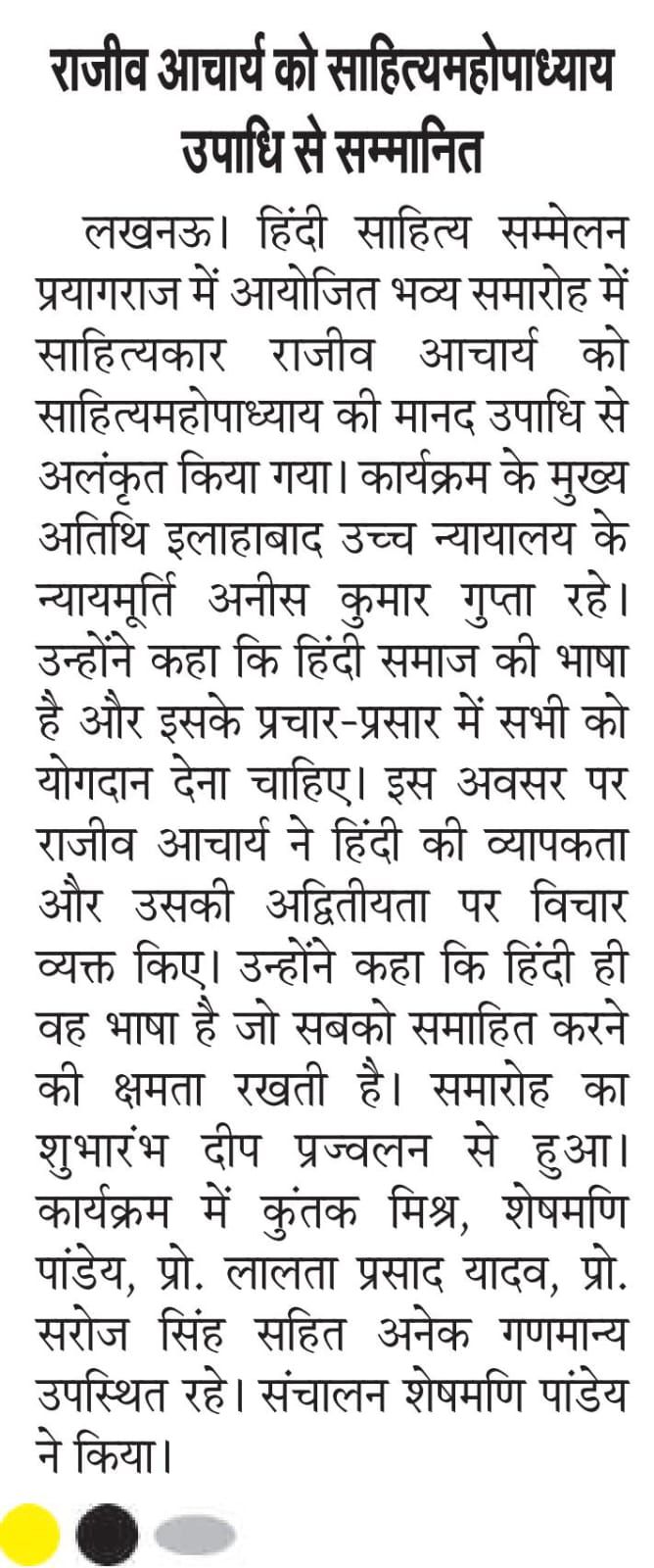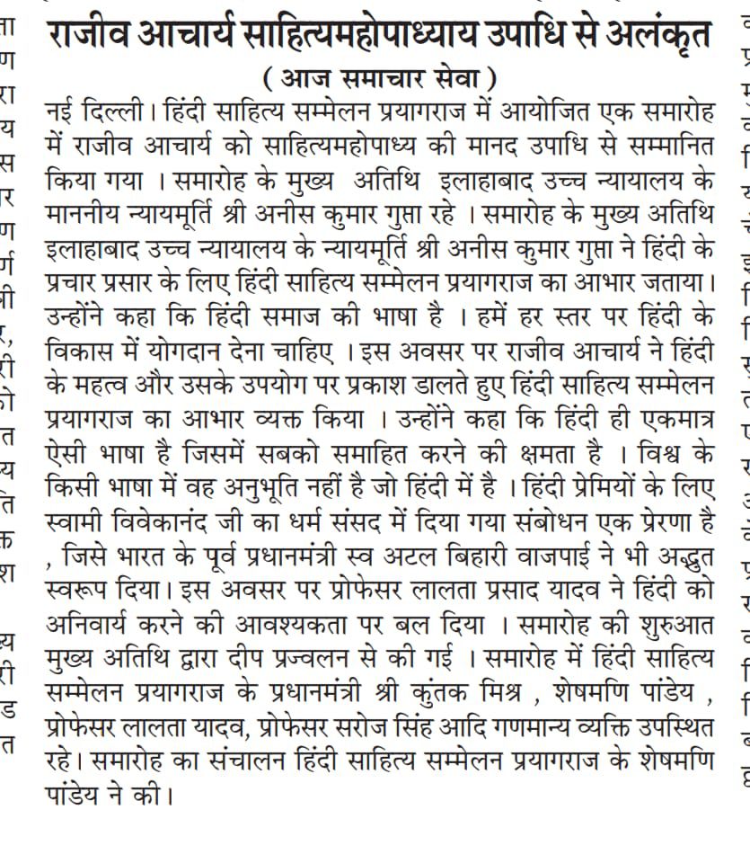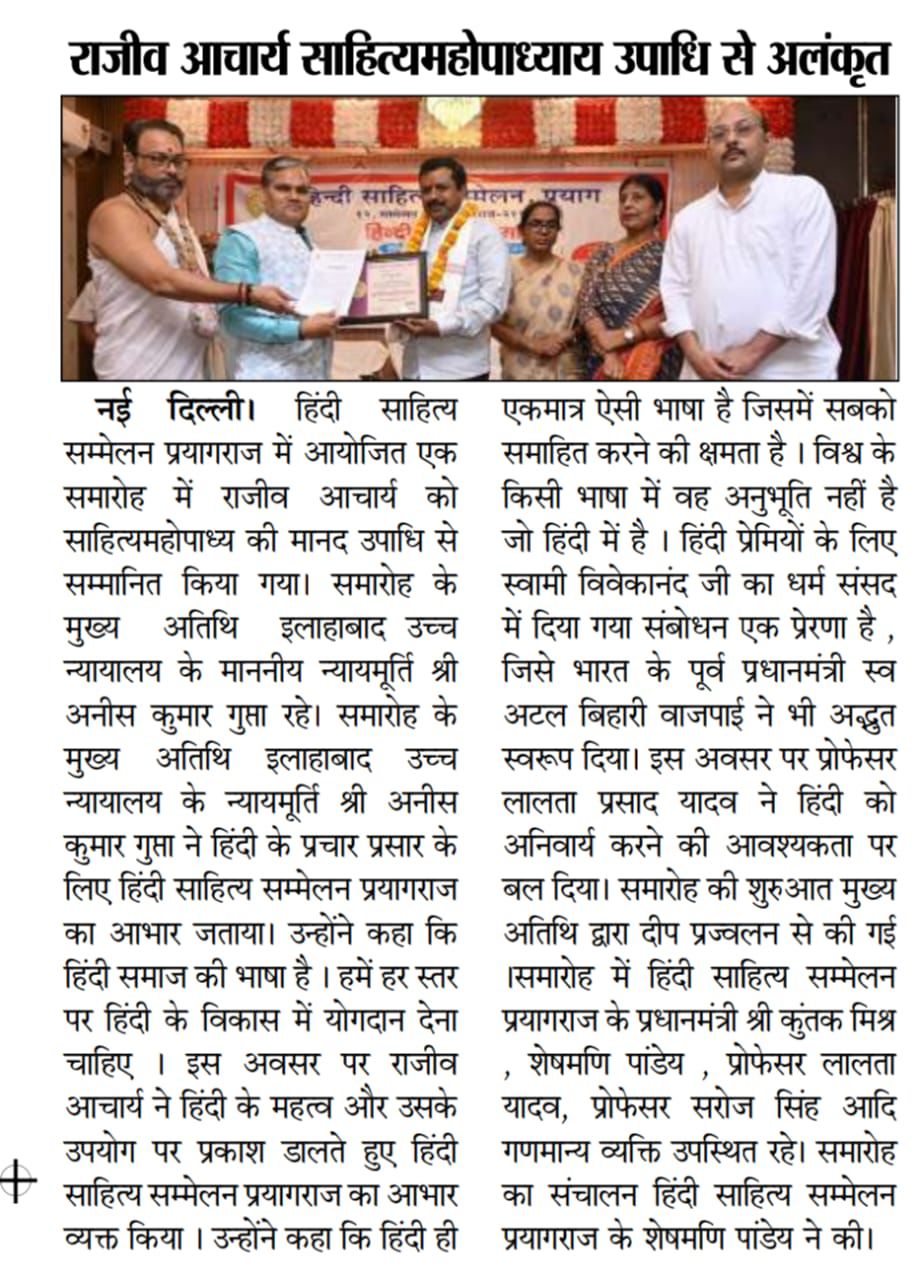 हिंदी दिवस के अवसर पर प्रयागराज में आयोजित हिंदी साहित्य सम्मेलन में ज्योतिषाचार्य एवं वास्तुशास्त्री राजीव आचार्य को “साहित्यमहोपाध्याय” की मानद उपाधि से सम्मानित किया गया।समारोह के मुख्य अतिथि इलाहाबाद उच्च न्यायालय के न्यायमूर्ति अनिश कुमार गुप्ता थे।इस अवसर पर आचार्य ने हिंदी भाषा के महत्व और उसके प्रचार-प्रसार पर प्रकाश डालते हुए कहा कि […]